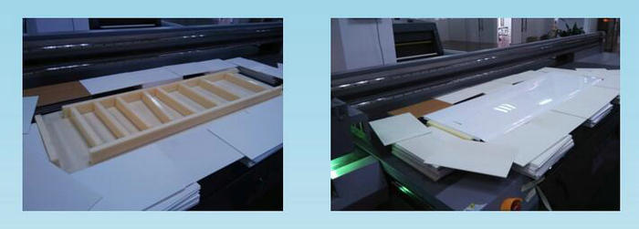 由于面板屬于板料,使用uv平板打印機(jī)就可以勝任。部分家電面板有支架,直接在uv平板打印機(jī)上打印高低不平,易刮到噴頭,且小車與臺(tái)面過(guò)高,邊沿UV光易反射到噴嘴造成瞬間堵孔。下面將詳細(xì)講述這類面板的打印方法。