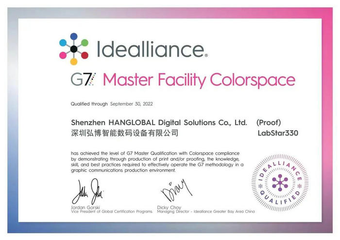 近日,UV打印機(jī)高端品牌漢拓?cái)?shù)碼兄弟公司弘博智能工業(yè)級(jí)數(shù)字標(biāo)簽機(jī)LabStar 330獲得了美國(guó)IDEAlliance(國(guó)際數(shù)碼企業(yè)聯(lián)盟)頒發(fā)的G7認(rèn)證最高級(jí)別認(rèn)證證書—G7 ColorSpace級(jí)別,成為國(guó)內(nèi)首臺(tái)通過(guò)G7最高級(jí)別認(rèn)證的數(shù)字噴墨標(biāo)簽機(jī)。弘博智能也因此成為中國(guó)數(shù)字噴墨印刷設(shè)備領(lǐng)域鮮有的獲得G7最高級(jí)別認(rèn)證的設(shè)備廠商。